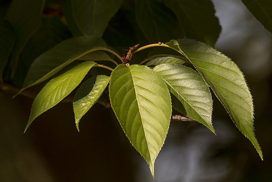 Le foglie portate da un picciolo ghiandoloso di 5-8 mm, sono semplici, alterne, penninervie, hanno lamina ovata o ellittica, con base cuneata o arrotondata e apice acuto, il margine è seghettato, la pagina superiore di colore verde scuro, lucida, quella inferiore più chiara con peli lungo le nervature.